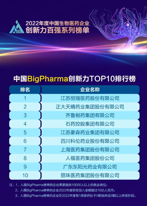 同日,2023米思会(中国医药健康产业共生大会)发布“2022年度中国生物医药企业创新力百强系列榜单”,AG亚游医药再蝉联“中国BigPharma创新力TOP10”榜首。该榜单自2021年启动评选以来,AG亚游医药稳居榜首。
